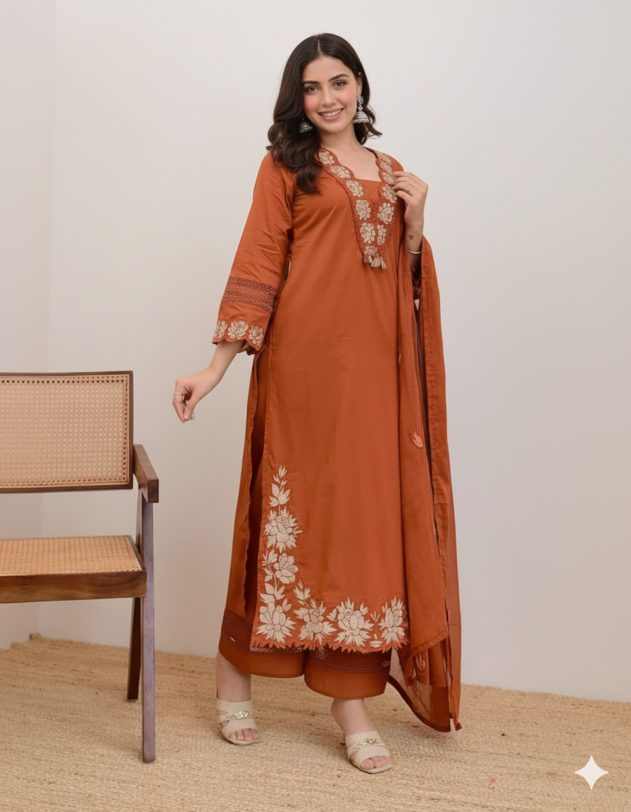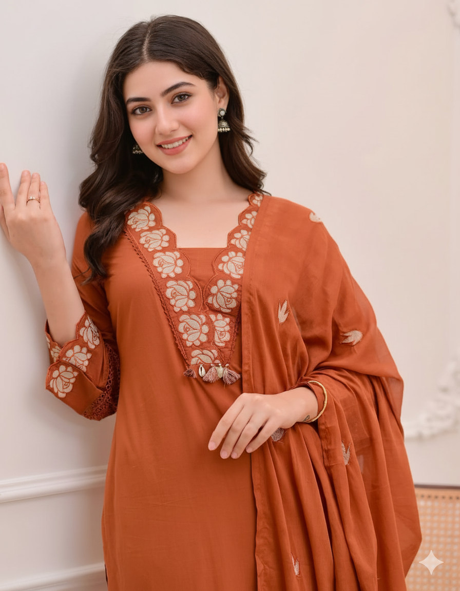 Crafted from soft, breathable fabric, this elegant outfit features intricate floral embroidery on the neckline, sleeves, and hem, adding a timeless charm. The straight-cut kurta is paired with comfortable trousers and a matching dupatta, making it a perfect blend of tradition and modern elegance.