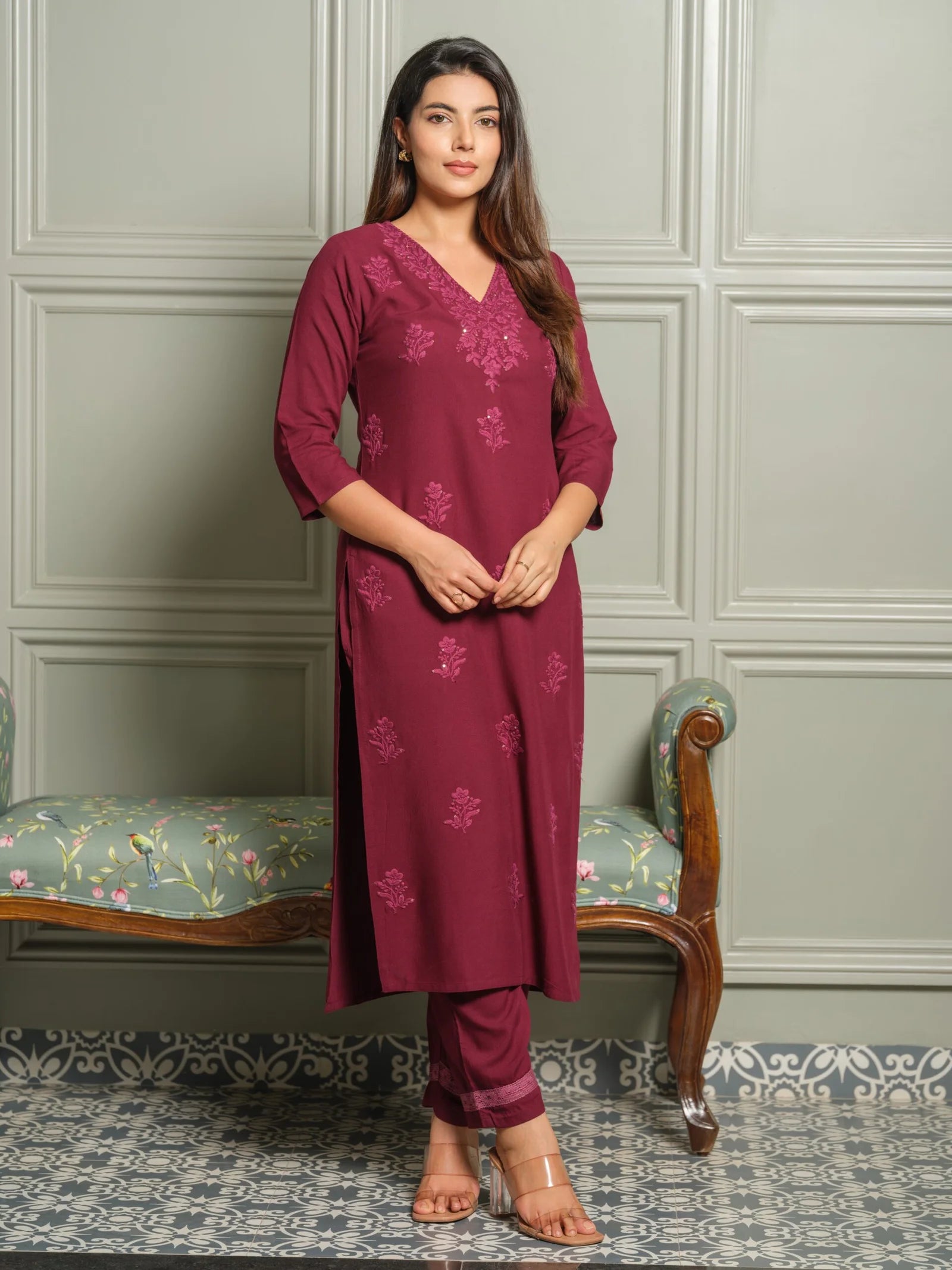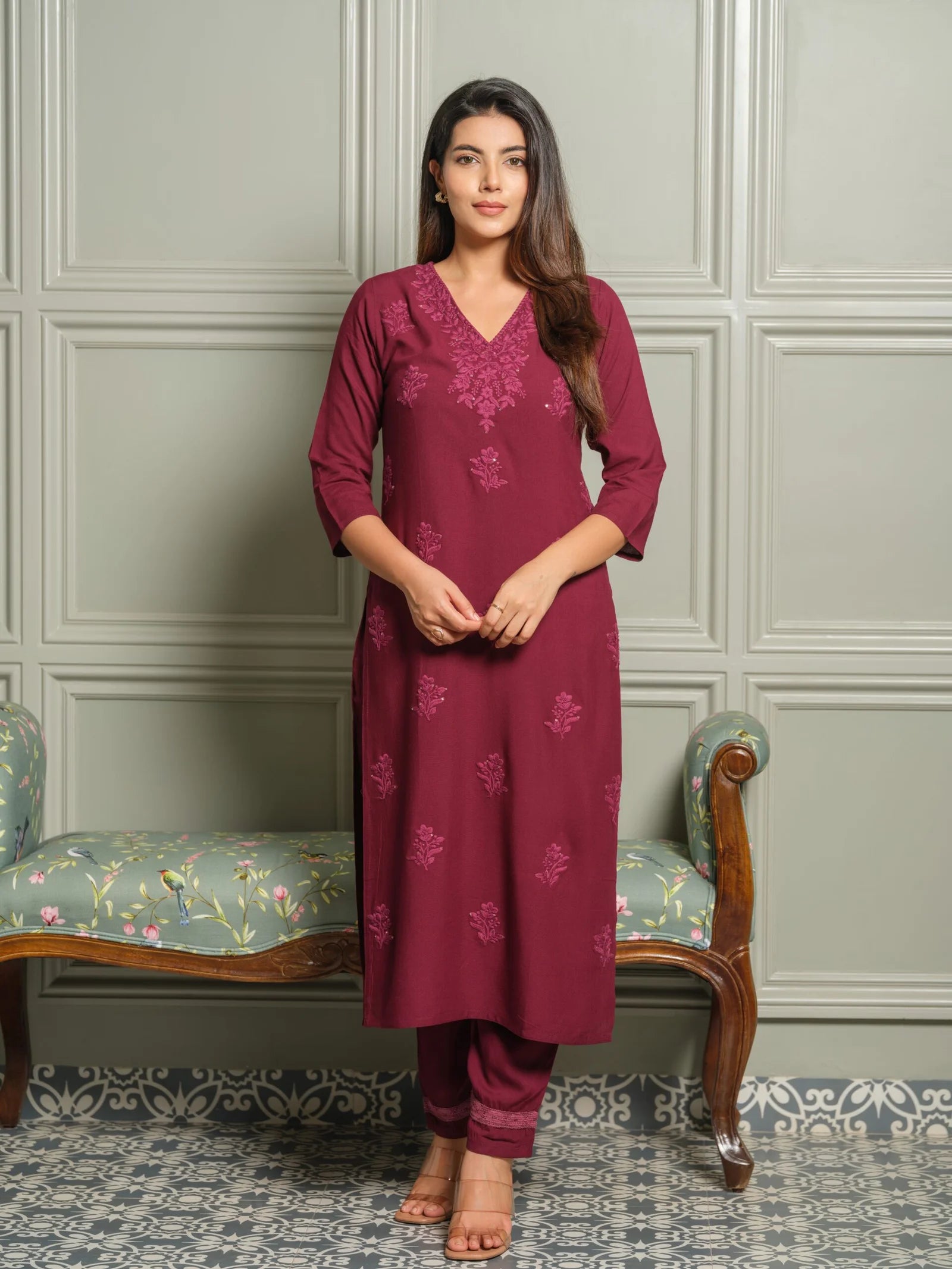 Elevate your ethnic wardrobe with this beautifully crafted Chikankari Embroidered Kurti Set, available in serene Sky Blue and rich Wine hues. Designed for both comfort and style, this 3/4th sleeve kurti features intricate Chikankari embroidery on the neckline and scattered motifs throughout the front, adding a timeless touch of elegance.