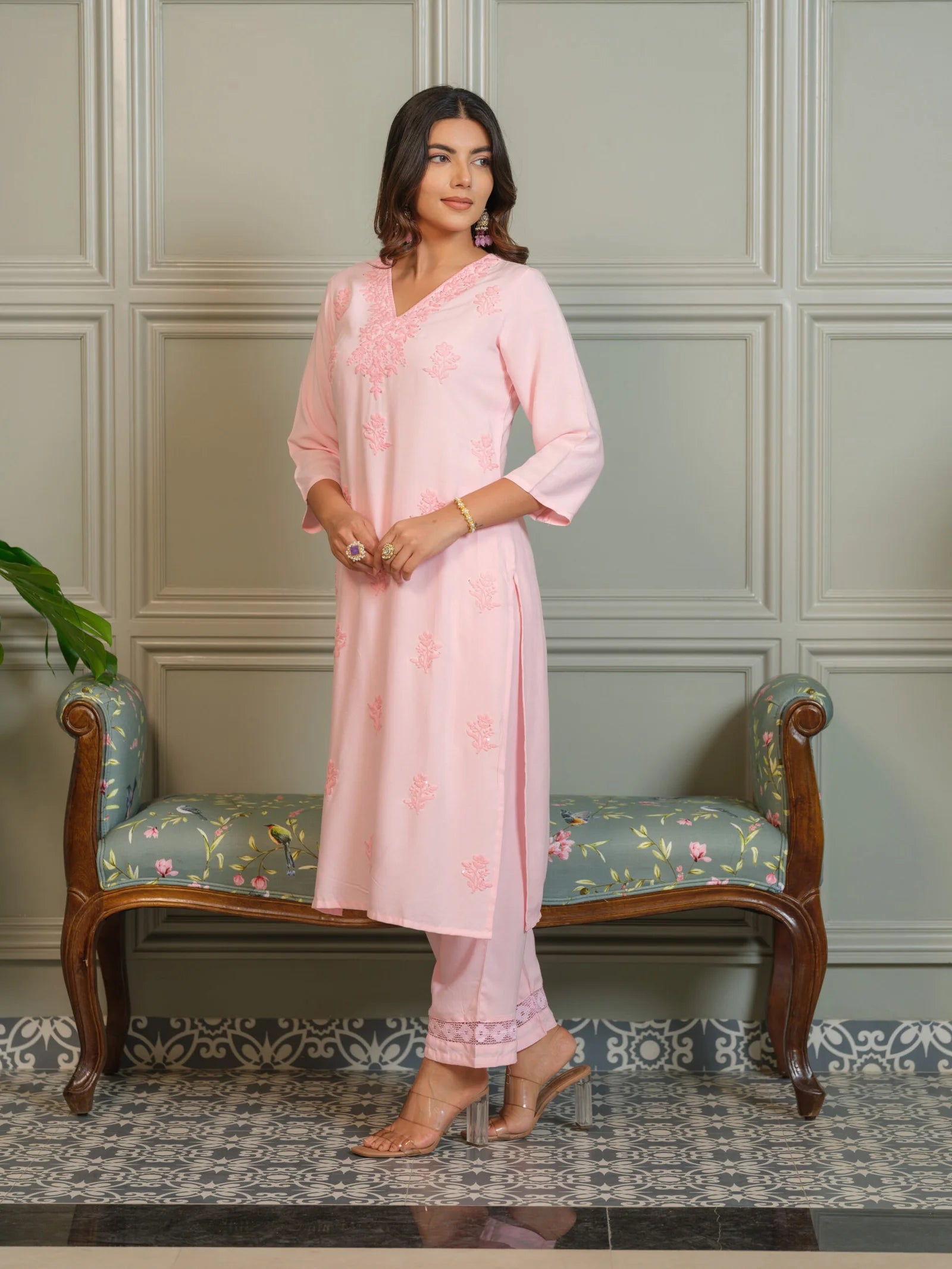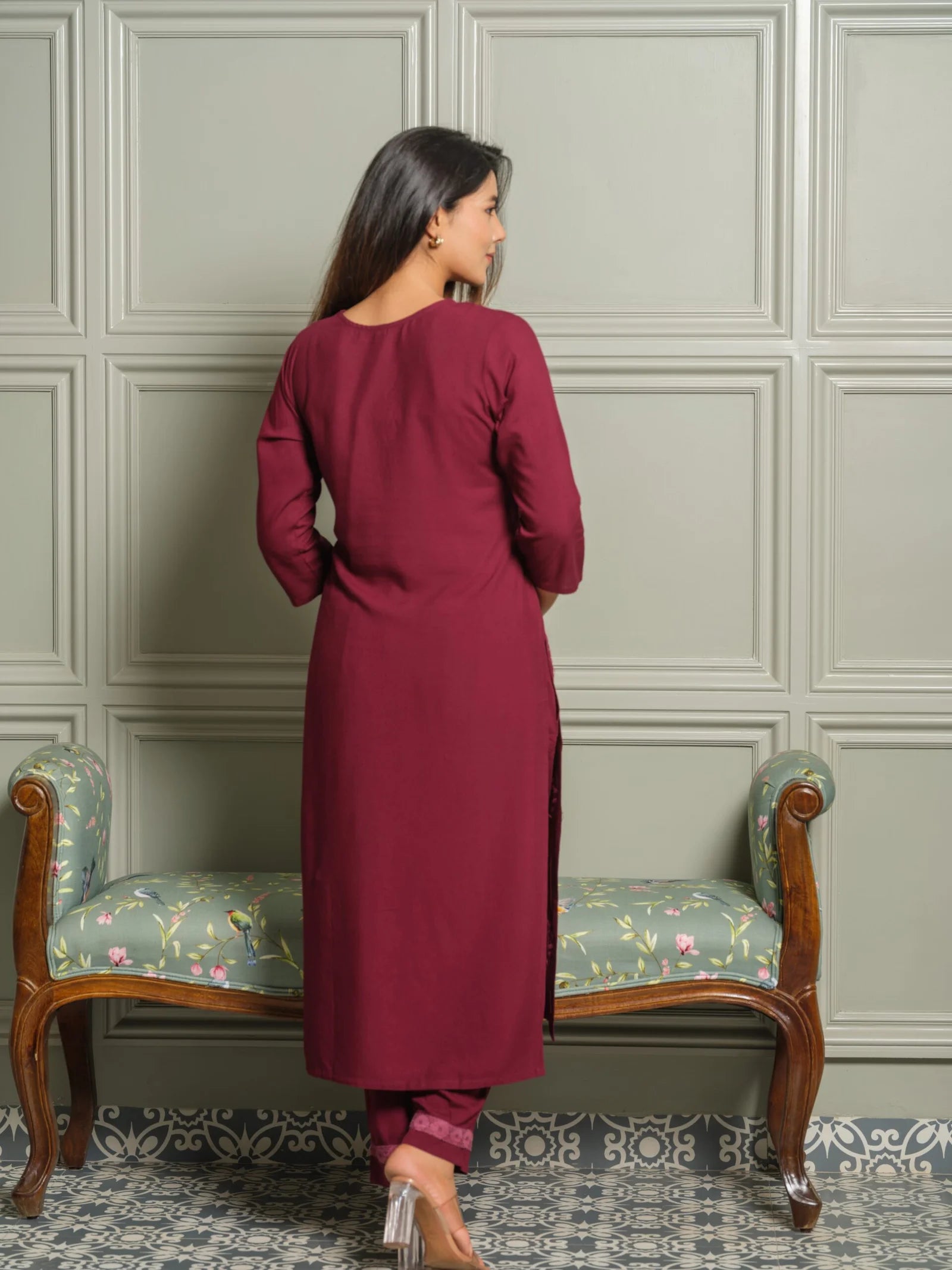 The matching straight pants come with delicate embroidered detailing on the hem, creating a graceful and cohesive look. Made from soft, breathable cotton fabric, this ensemble is perfect for daily wear, casual outings, or festive gatherings.