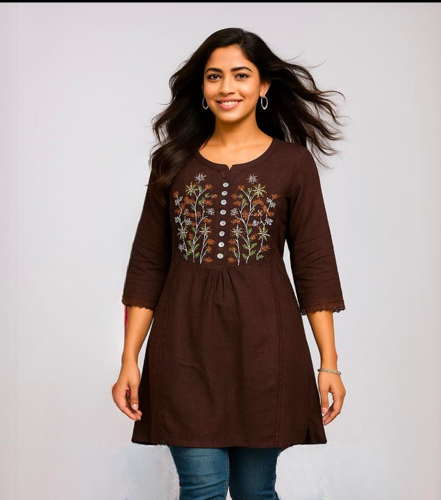Elevate your everyday style with our Embroidered Elegance Tunic, available in three earthy tones . These 3/4 sleeve tunics feature delicate floral embroidery across the chest and a pleated front that adds a graceful flow to the silhouette. Finished with soft lace trim at the sleeves and hem, these versatile kurtis pair effortlessly with jeans, leggings, or trousers – perfect for both casual outings and relaxed office wear.